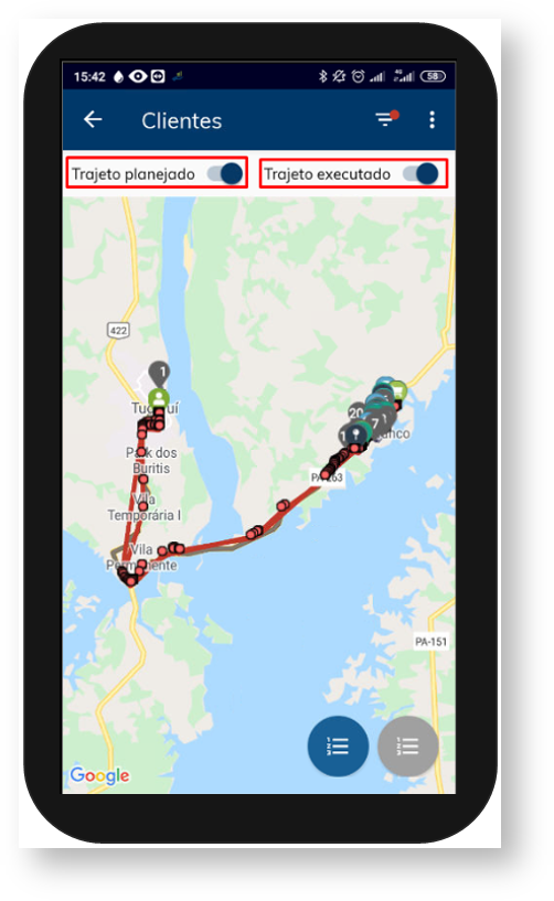 5.1 Ao selecionar trajeto planejado, será mostrado no mapa conforme os clientes agendados para o vendedor. Clique no ícone