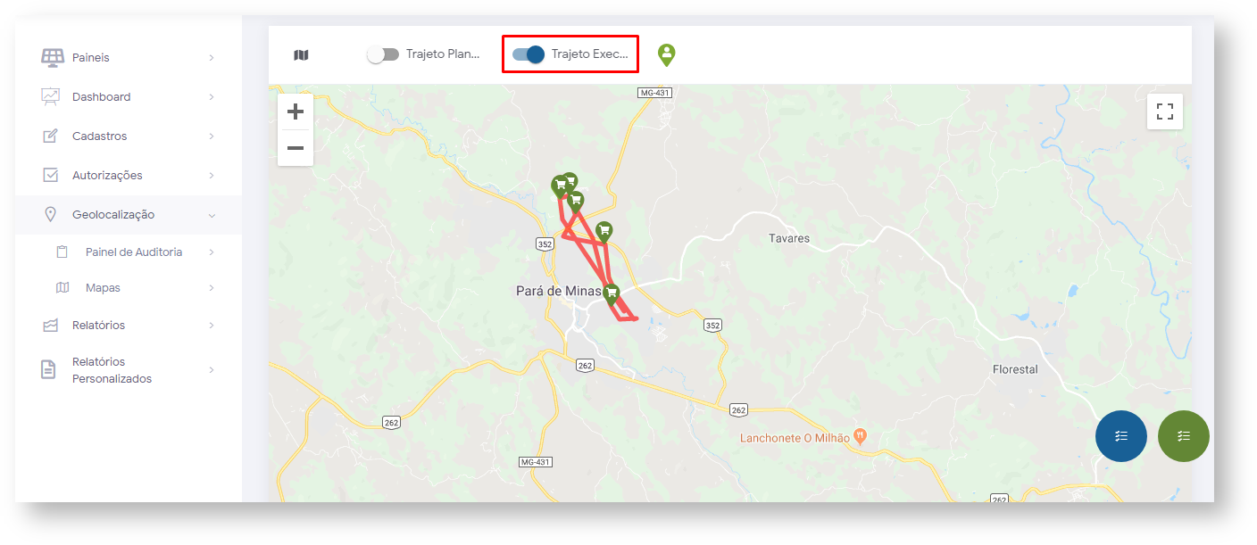 9.1 - Após selecionar o vendedor desejado, marque ambas as opções, trajeto planejado e trajeto executado, além de mostrar no mapa irá abrir ícones relacionados aos mesmos no canto direito inferior da tela;