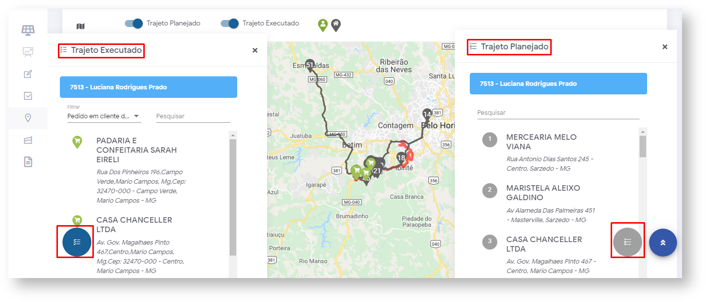 9.2 - Clicando nos ícones, serão abertas as janelas com informações de ambos para que possa ser comparado se o trajeto executado corresponde ao planejado e se não, onde está divergente.