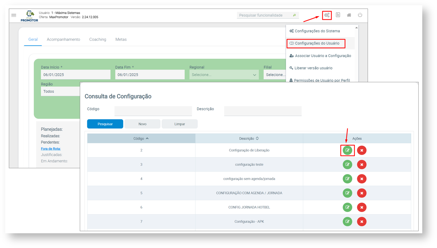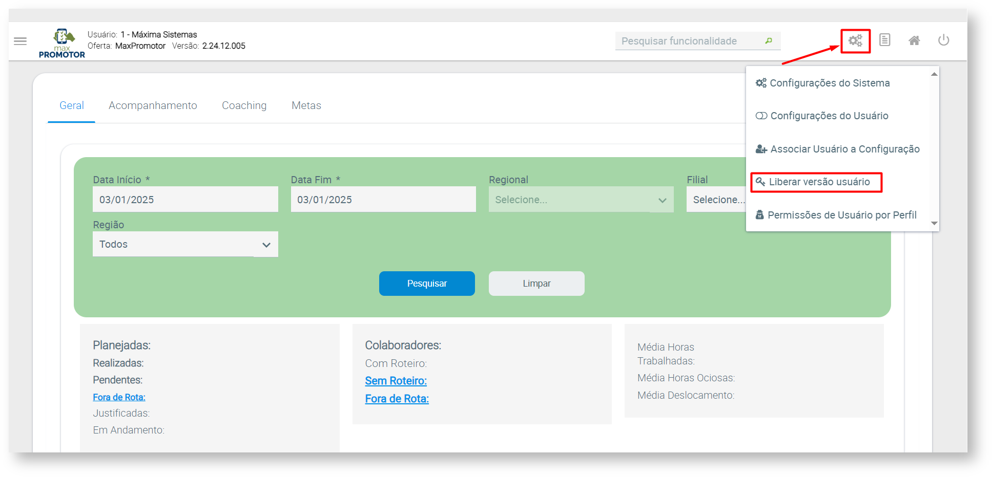 1- Na página inicial do maxPromotor clique no ícone de engrenagem (CONFIGURAÇÕES)