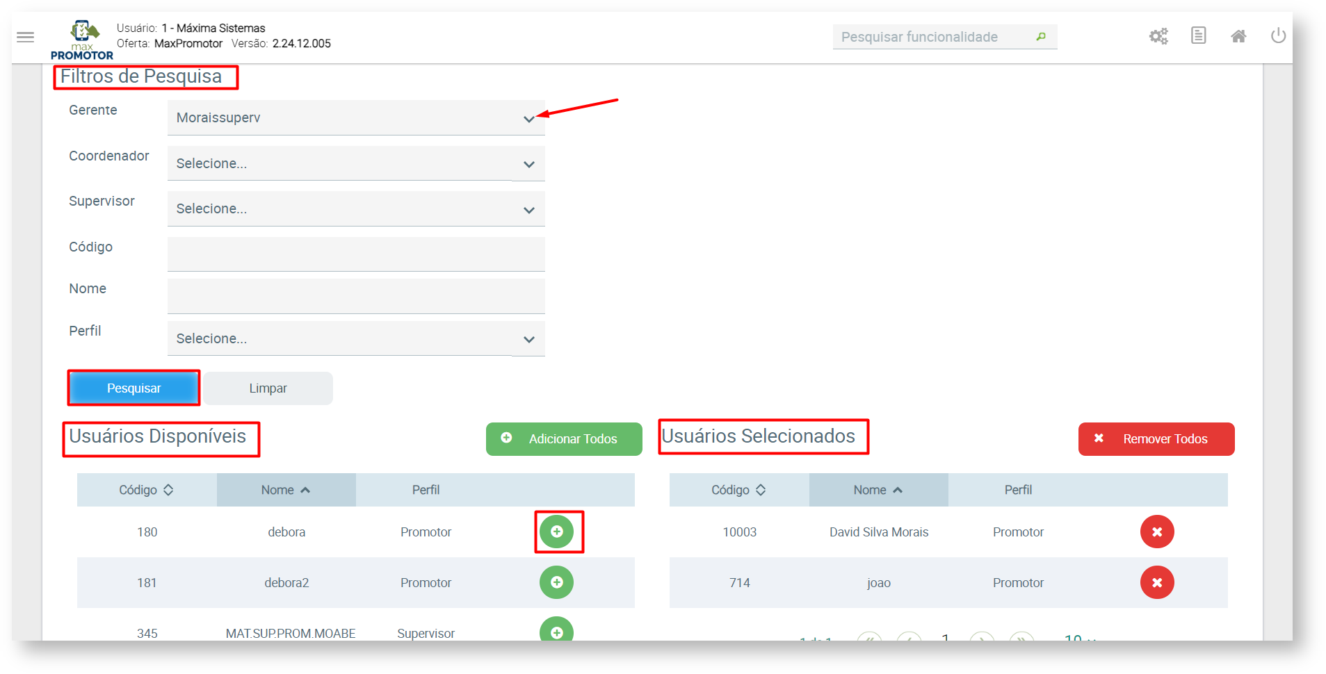 5- No Filtro selecione Gerente, coordenador e ou supervisor e clique em pesquisar