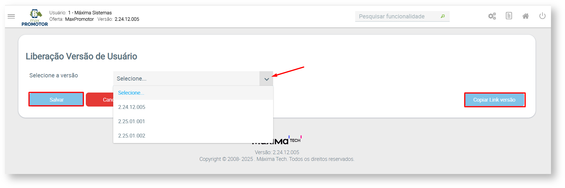 4- Ao selecionar a versão abrirá outra tela para vincular a mesma ao usuário