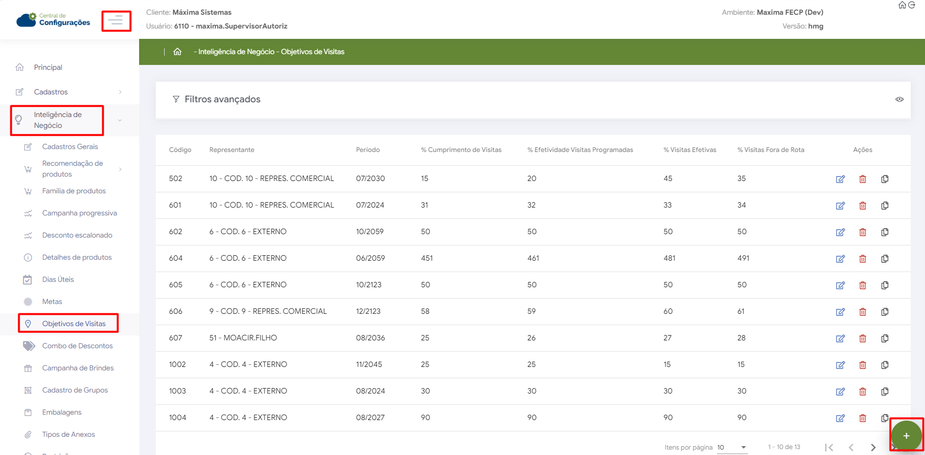 2- clique em Inteligência de Negócios> Objetivos de visita