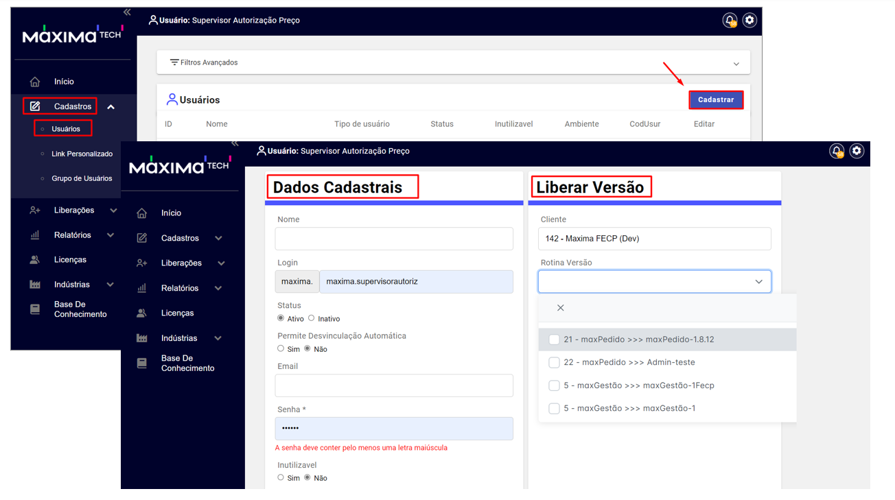 - Cadastro>Usuários> Cadastrar> preencher dados solicitados.