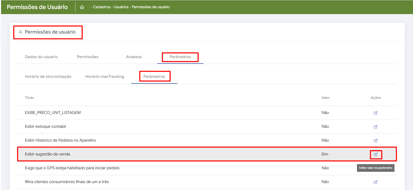 4- Localize o parâmetro Exibir Sugestão de Venda, clique no ícone de edição da coluna Ações e verifique se o mesmo está habilitado