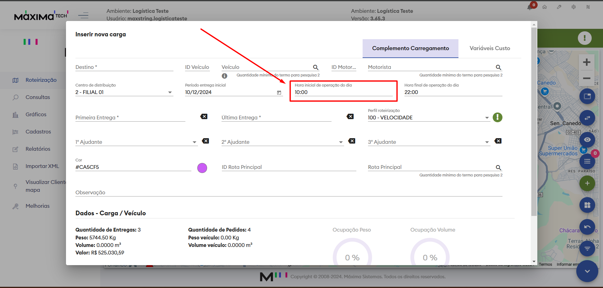- Após o parâmetro ativo, o sistema irá calcular o tempo que demorará para chegar ao cliente e irá dizer a que horas o motorista precisará sair para chegar no endereço até o horário declarado neste campo em destaque.