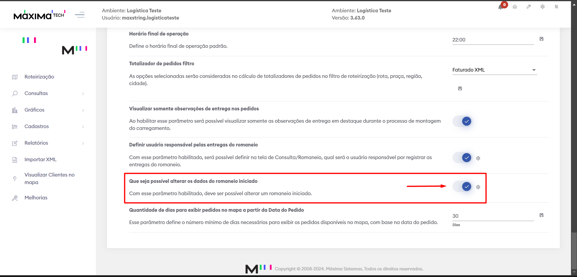 • Rolar a tela até o final, ao encontrar o parâmetro "Que seja possível alterar os dados do romaneio iniciado", caso o parâmetro esteja desativado, ative-o.