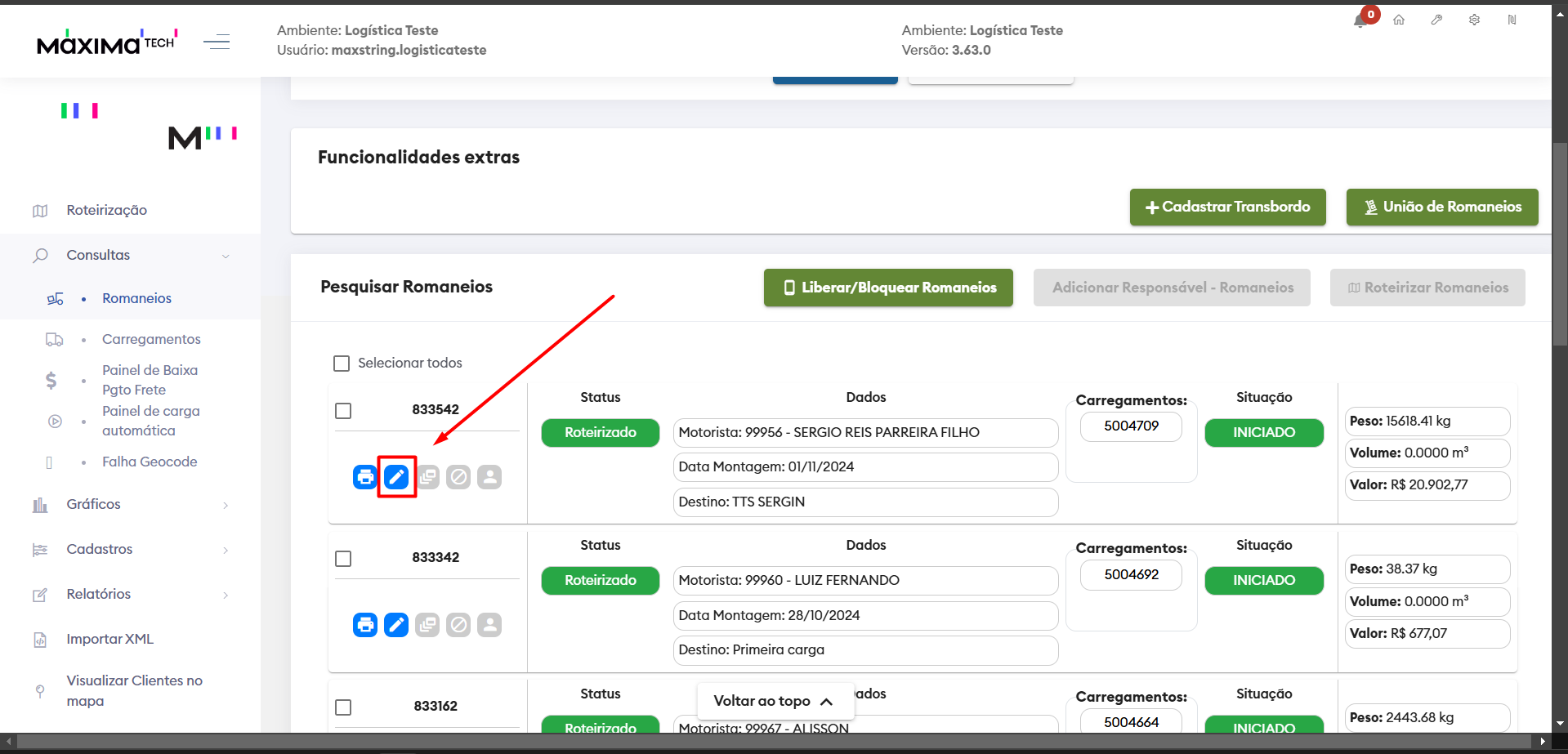 • Selecione o carregamento já iniciado que desejar e clique em Editar
