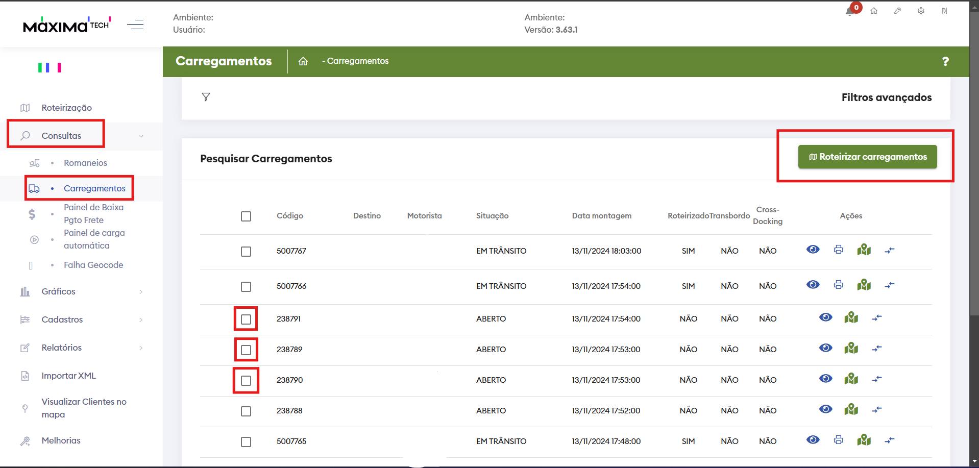 Da mesma forma também pode ser feito pelos Carregamentos. Basta abrir a aba Consultas, depois Carregamentos, selecionar os carregamentos não roteirizados e em seguida clicar em Roteirizar Carregamentos.