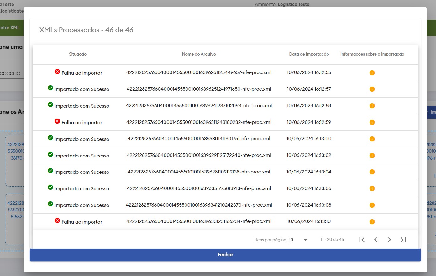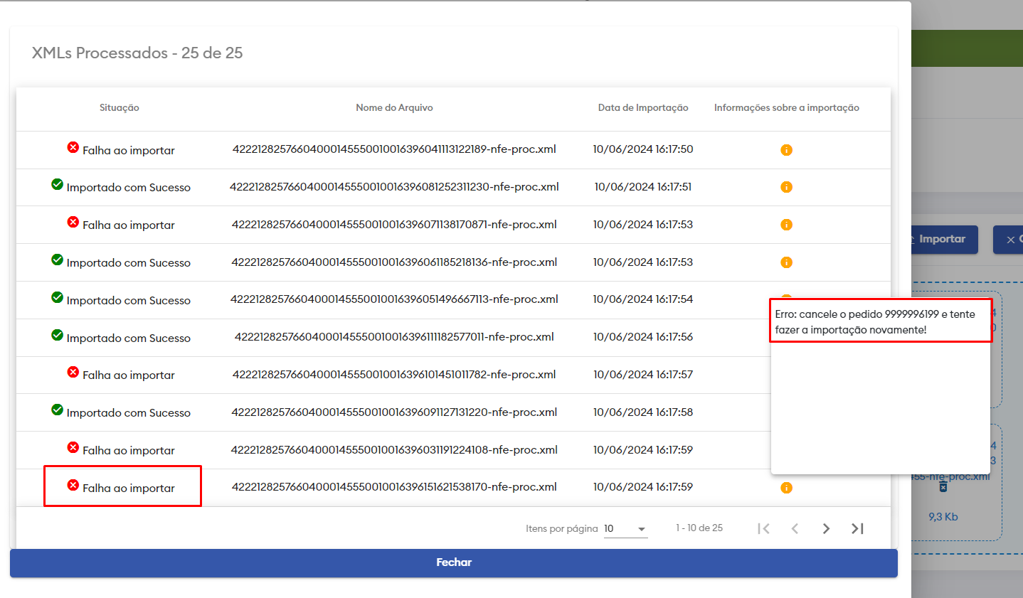 - Caso apresente falha ele também ira constar em informações sobre a importação que ira listar o motivo do erro,