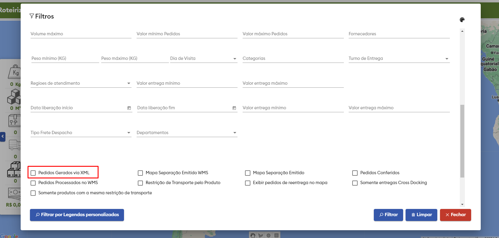 - Para montagem da carga, basta abrir a tela de filtros do roteirizador e marcar a opção de "Pedidos gerados via XML",