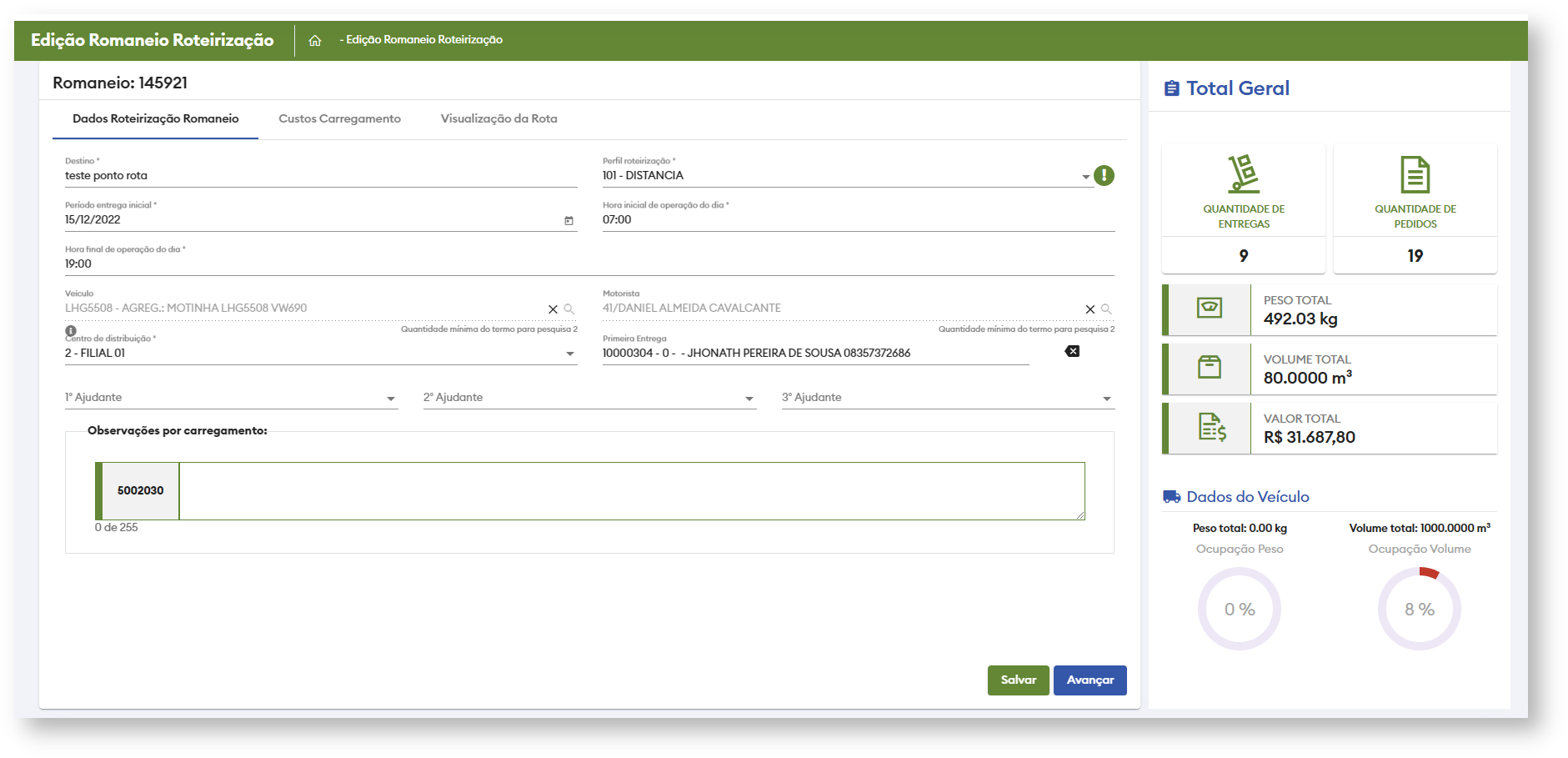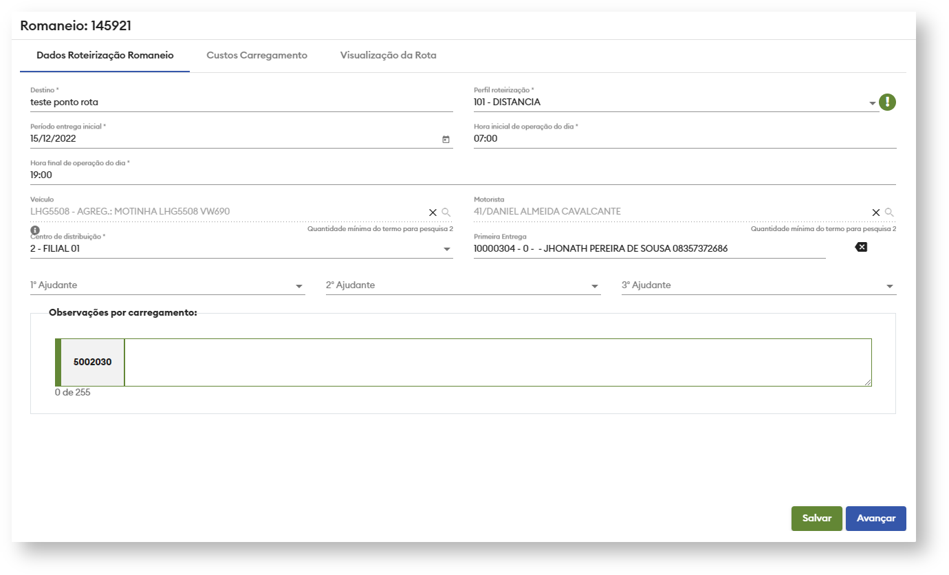 Segue o mesmo fluxo da tela de edição de dados da roteirização do romaneio com a diferença de ser voltada para o carregamento.
