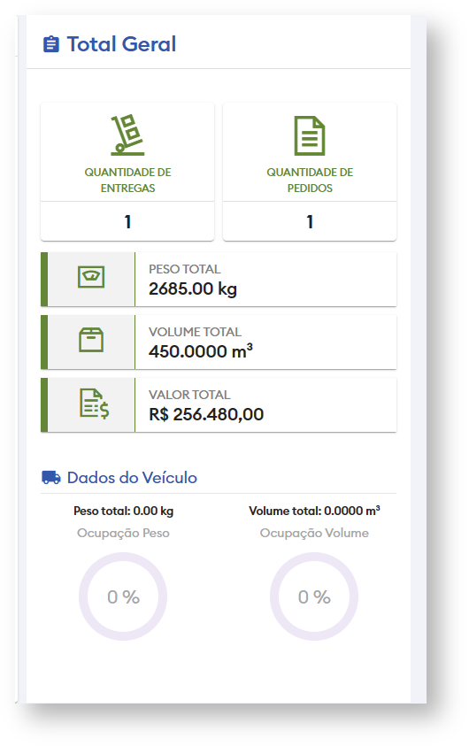 Na parte lateral direita da tela, sempre estará disponível os totalizadores gerais, independente de qual aba você se encontra. Esses totalizadores indicam o valor total, peso e volume da carga e a porcentagem de sua ocupação conforme o veículo selecionado. Inclusive caso haja mudança de veículo o totalizador é atualizado em tempo real: