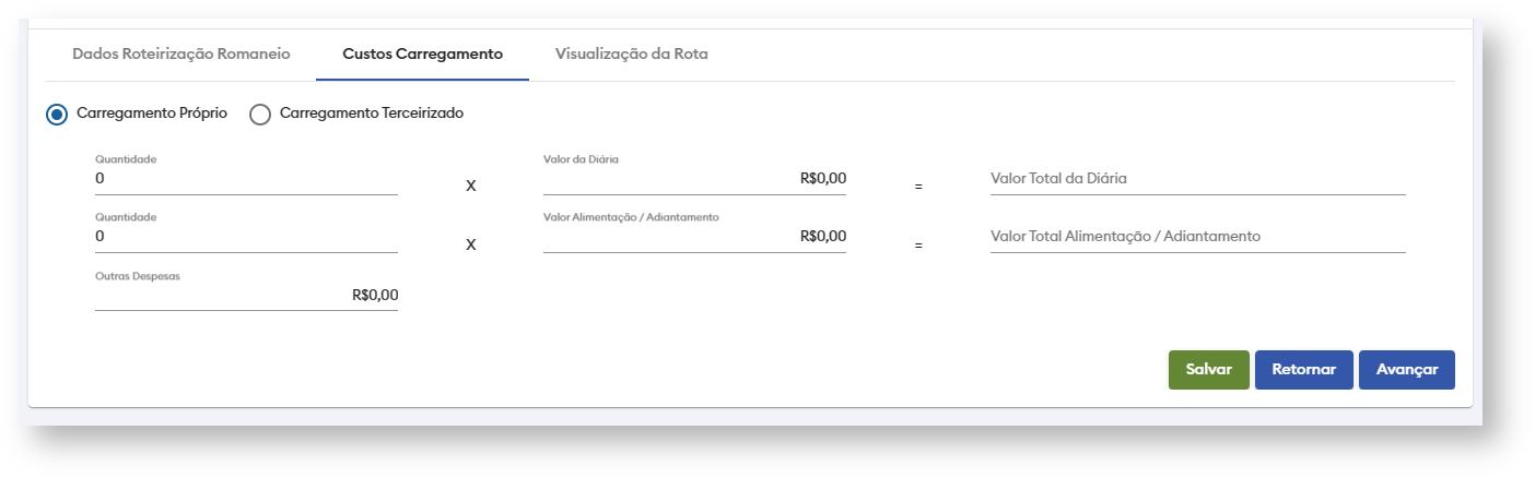 A aba de Custos Carregamento segue o mesmo padrão dos custos que existe nos dados de roteirização do carregamento, o usuário pode escolher entre "Carregamento Próprio" ou "Carregamento Terceirizado", preenchendo os valores que serão considerados ao calcular os custos na roteirização.