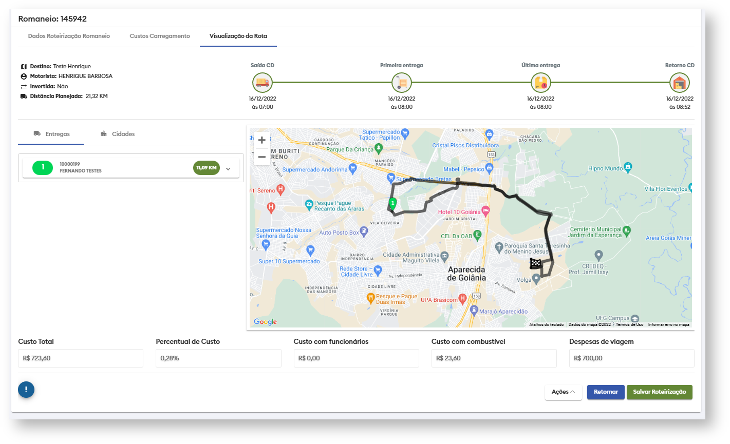 Se o romaneio já estiver Roteirizado é possível alterar alguns dados e “Salvar” o romaneio diretamente nessa página sem necessidade de reprocessar e roteirizar, caso não esteja roteirizado o botão abaixo de salvar estará desativado e será necessário prosseguir os próximos passos até a “Visualização de Rota” que ocorrerá a roteirização.