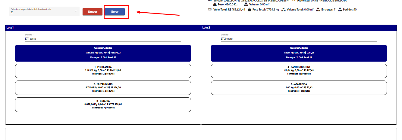 Quantidade de lotes: Permite informar a quantidade de lotes presente no veículo para realizar a quebra dos lotes.