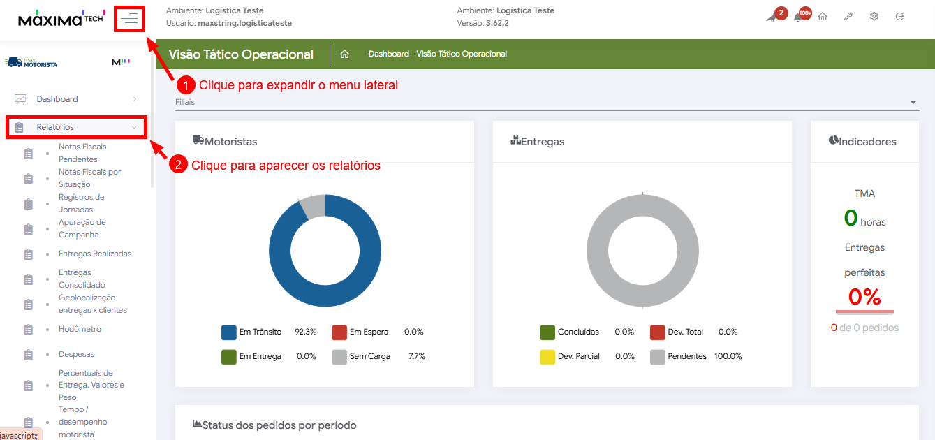 1 - Na tela inicial do maxMotorista, clique no ícone da esquerda ao lado do logotipo para expandir o menu lateral e, em seguida, clique em Relatórios para aparecer todos os relatórios disponíveis.