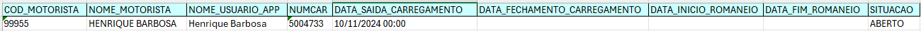 Últimos Carregamentos por Motorista → O relatório monitora o status de carregamentos e romaneios dos motoristas, incluindo datas de operação e situação do processo.