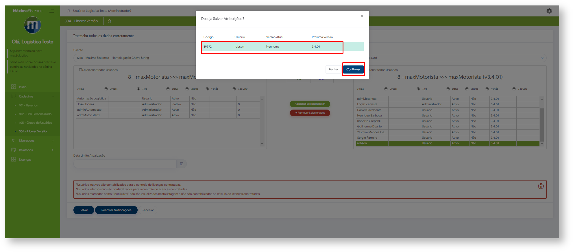 - No canto esquerdo da tela temos a lista de usuários que ainda não possuem versões liberadas, já no canto direito, temos os usuários já vinculados a determinada versão.