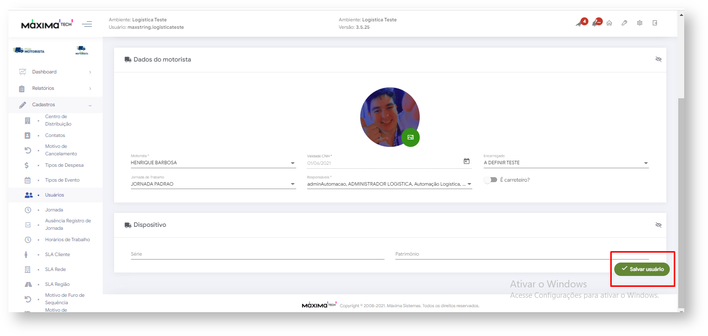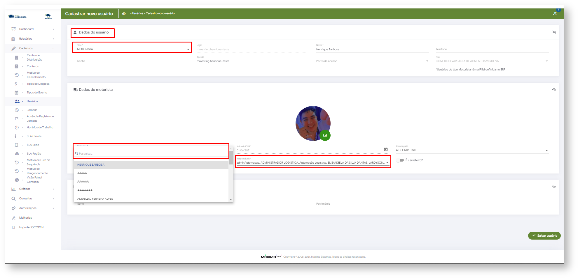 - Preencher com as informações solicitadas e no campo “Dados de usuário” selecionar o usuário do ERP que será vinculado ao motorista.
