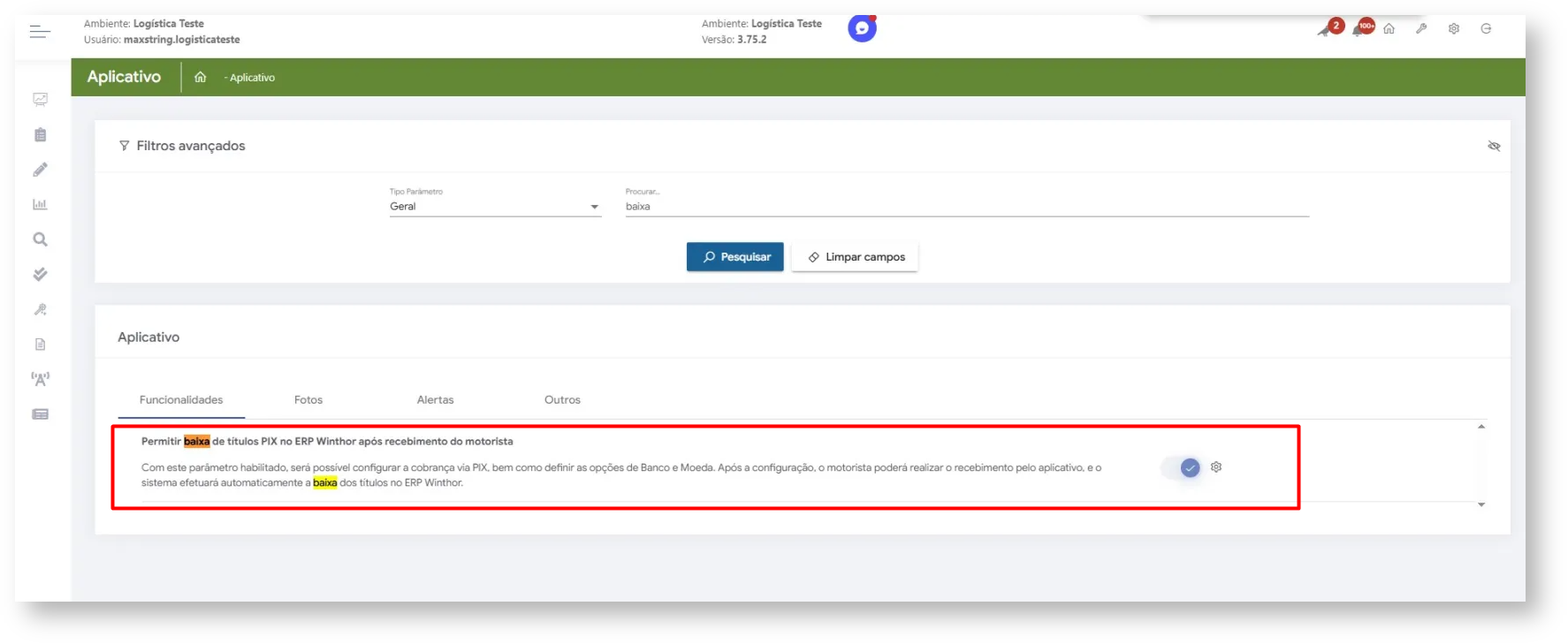 - Em seguida, acesse o MaxMotorista e habilite o parâmetro necessário para permitir a baixa automática de títulos via PIX.