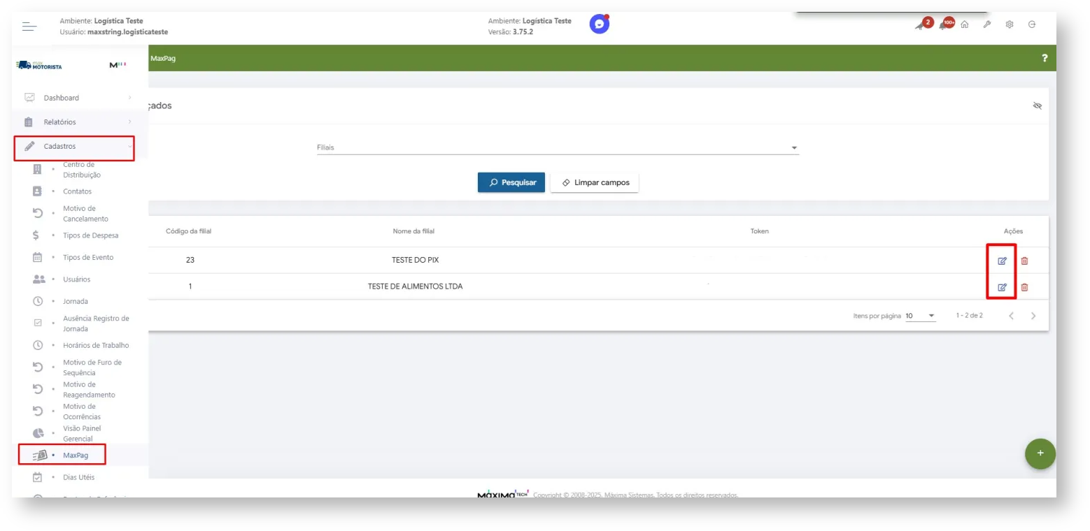 Acesse a aba de Cadastros no MaxPag e edite a filial que contempla o pagamento via PIX.
