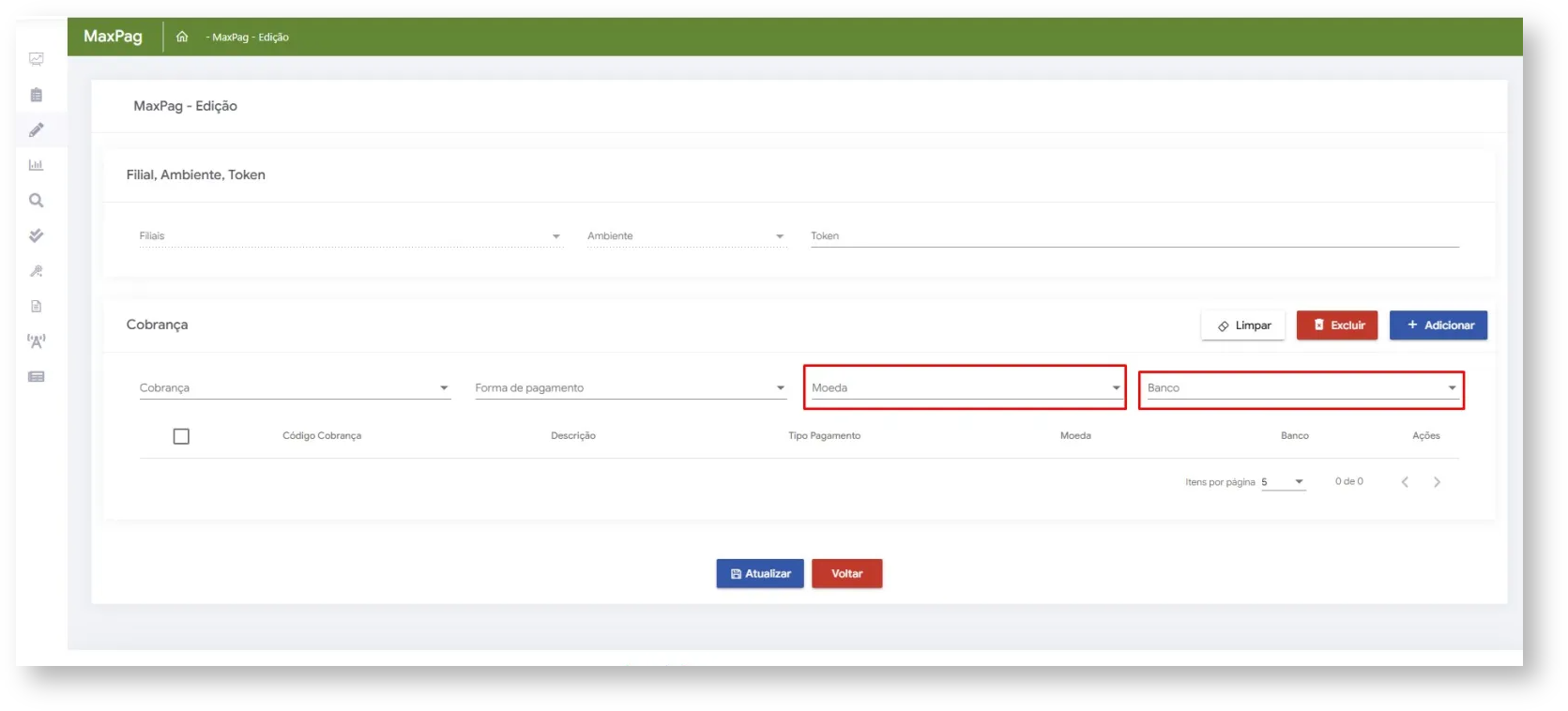 2. Com o parâmetro ativo, serão exibidas as opções de Banco e Moeda. Essas informações são provenientes do Winthor e devem estar cadastradas corretamente no ERP.