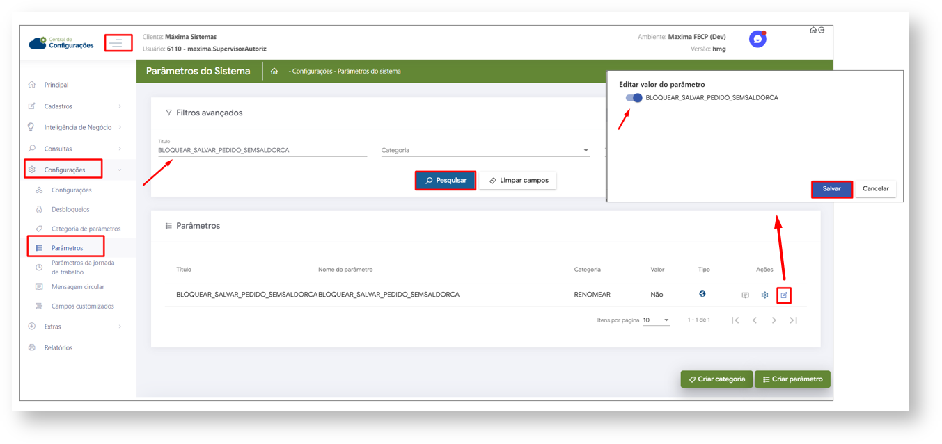 2- Pesquise pelo Parâmetro BLOQUEAR_SALVAR_PEDIDO_SEMSALDORCA