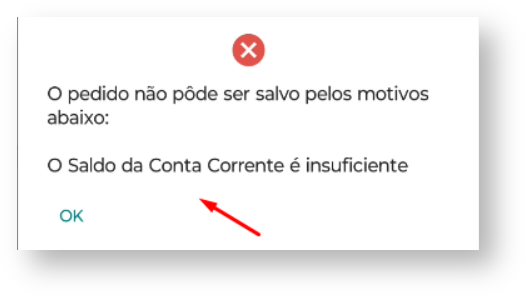 Com essa configuração, se o RCA tentar salvar um pedido utilizando conta corrente, o sistema bloqueará a finalização caso não haja saldo disponível.