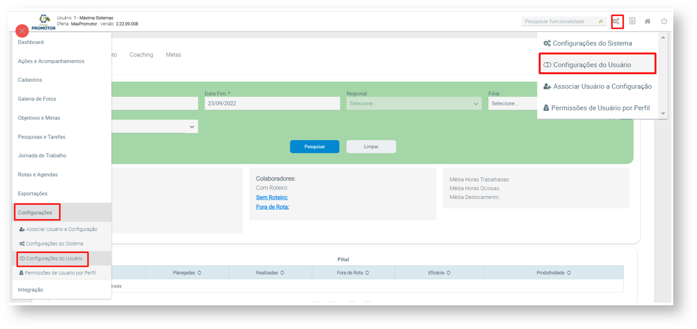 , clique na opção Configurações >> Configurações do Usuário, ou através do ícone