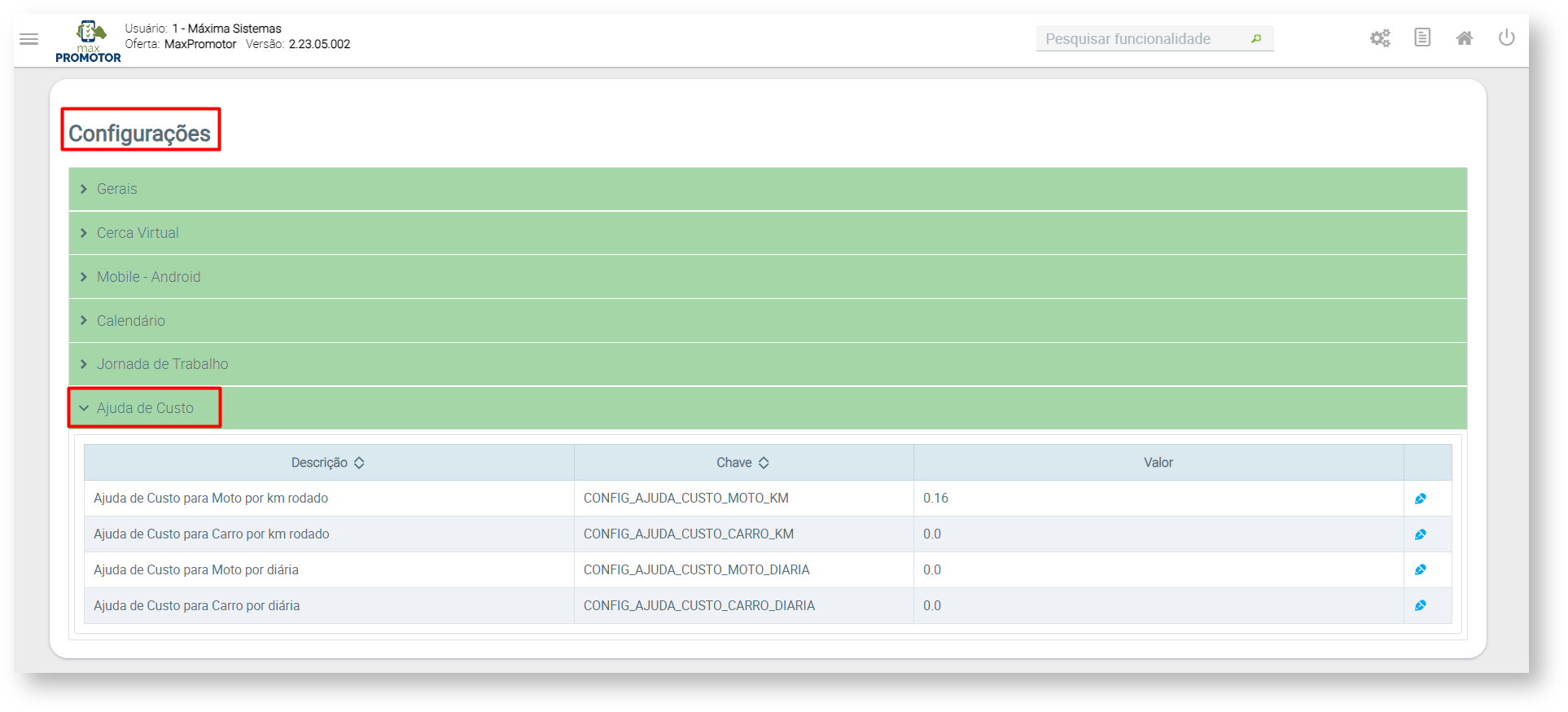 1.3 Na tela de configurações clique na aba Ajuda de custo, ative os parâmetros verificando se vai utilizar a ajuda de custo por km rodado ou ajuda de custo diária e definir os valores, após realizar as configurações clique em salvar.