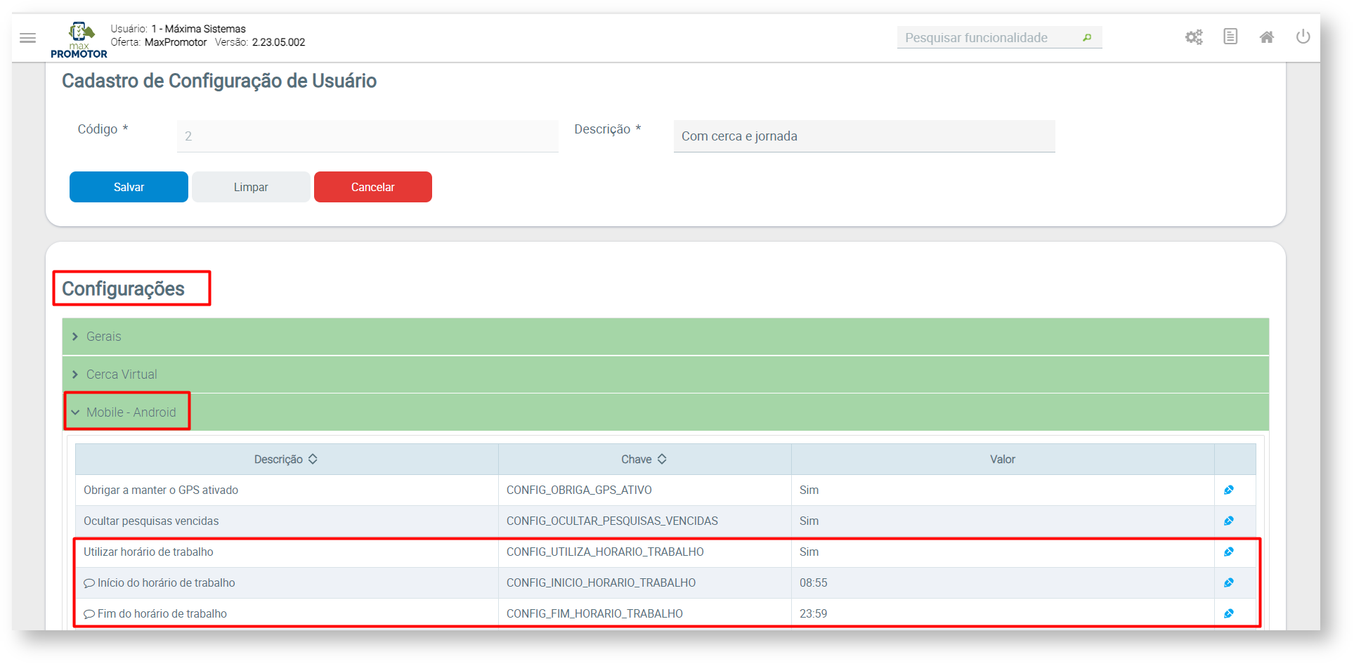 1.5 Para que o Percurso Percorrido e Percurso Trabalhado, apresentados no Relatório de Ajuda de Custo de Combustível, sejam calculados dentro de um horário fixo de trabalho, os parâmetros abaixo na imagem devem ser editados conforme o negócio.