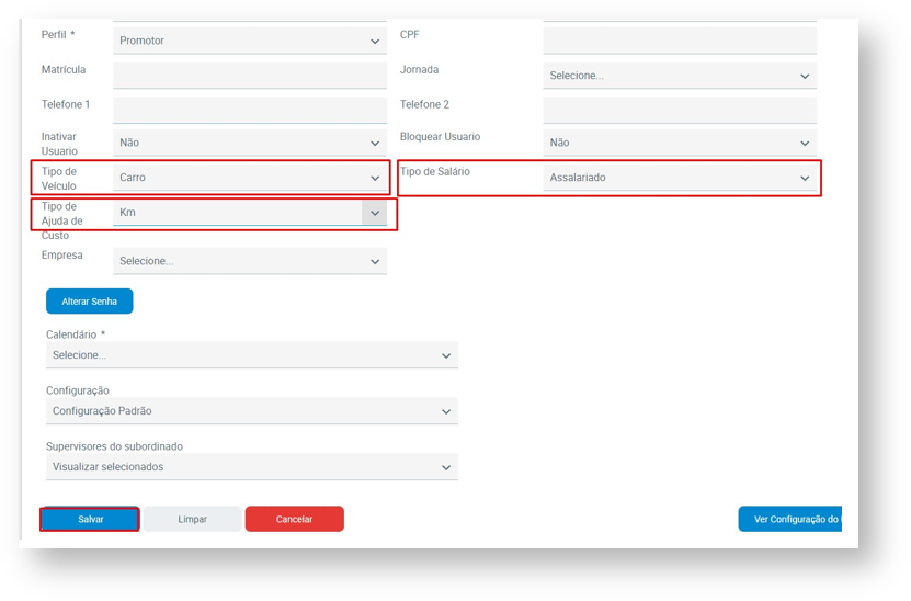 2.3 Inseria as informações relacionadas a ajuda de custo como o tipo de veículo, tipo de salário e tipo de ajuda de custo e depois salvar.