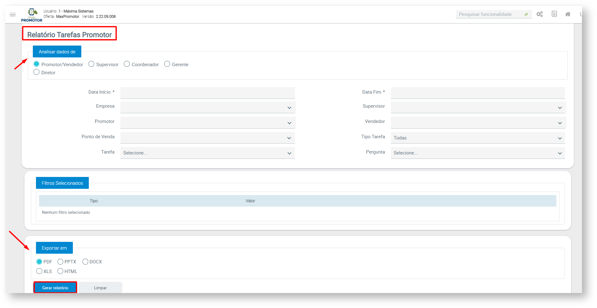 1.2 Preencher todos os filtros conforme a necessidade, lembrando que as opções que tem o asterisco ( * ) são obrigatório o preenchimento. Na opção Exportar em selecione o tipo de extensão que será gerado e clique em Gerar Relatório.