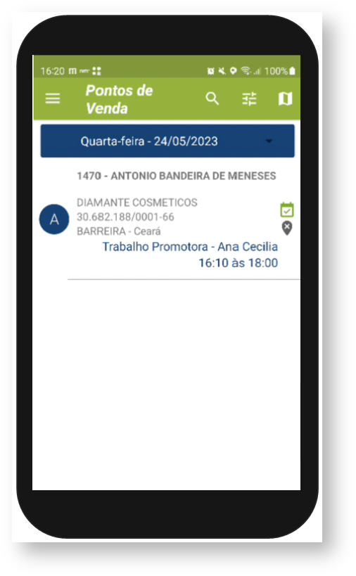 4.1 Após ter sido salvo a etapa acima, o promotor que teve na agenda essa inserção de trabalho, ao sincronizar para o aplicativo, terá informado a descrição do trabalho com os horários configurados.