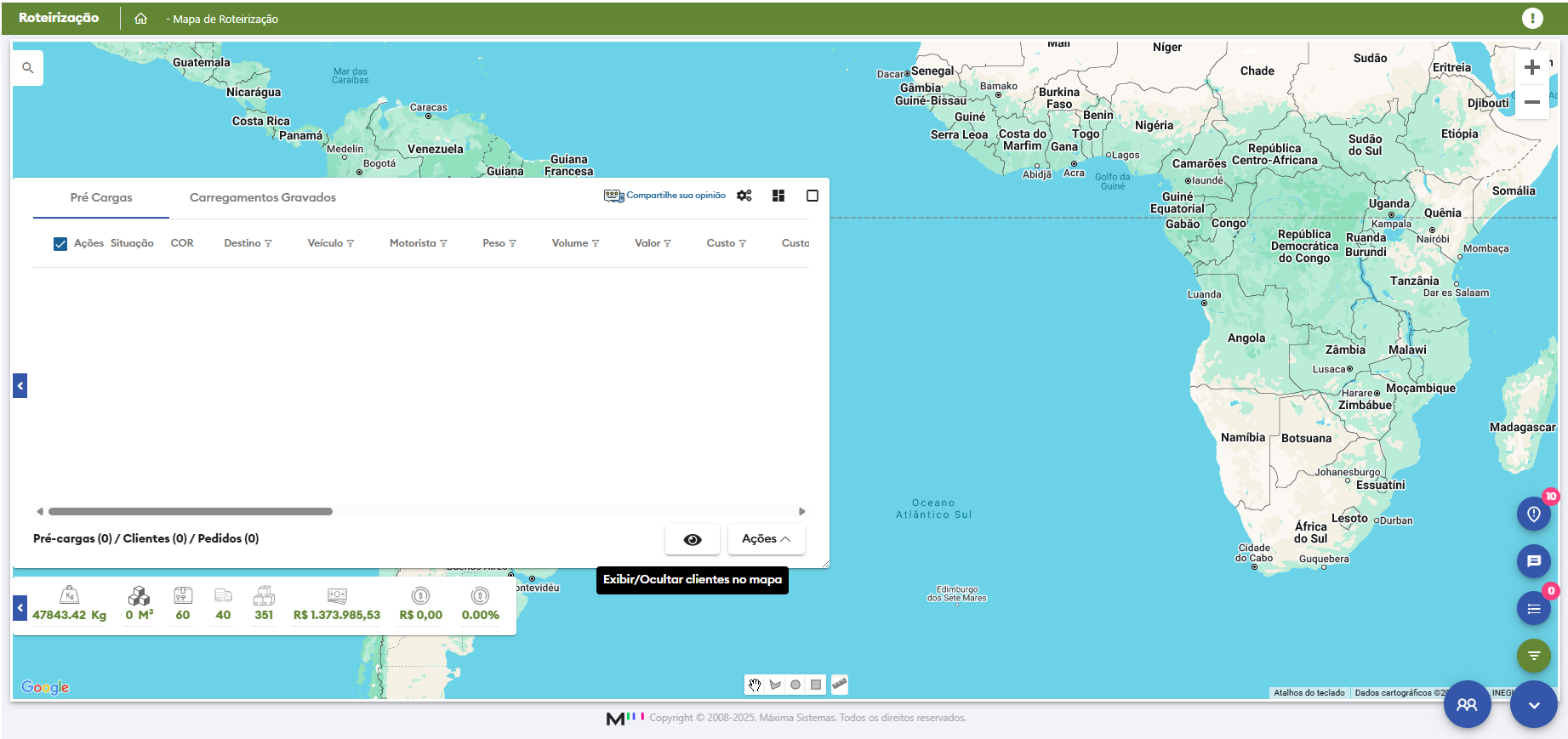 É possível exibir os PINs que estão ou não em pré-cargas no mapa. A novidade facilita a usabilidade durante a montagem de carregamento, oferecendo mais flexibilidade.