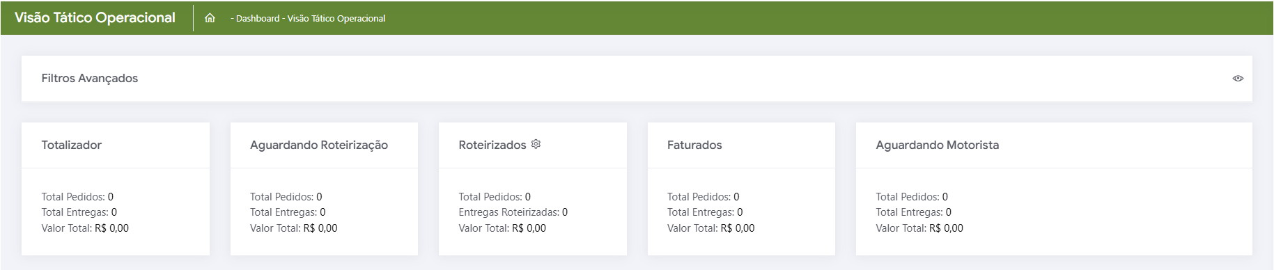 O dashboard do maxMotorista permite a visualização segmentada da evolução dos pedidos e entregas a partir de cards interativos que exibem os status dos pedidos em cada etapa do processo, como: Aguardando Roteirização; Roteirizados; Enviados para Faturamento; Faturados; e Aguardando Motorista.
