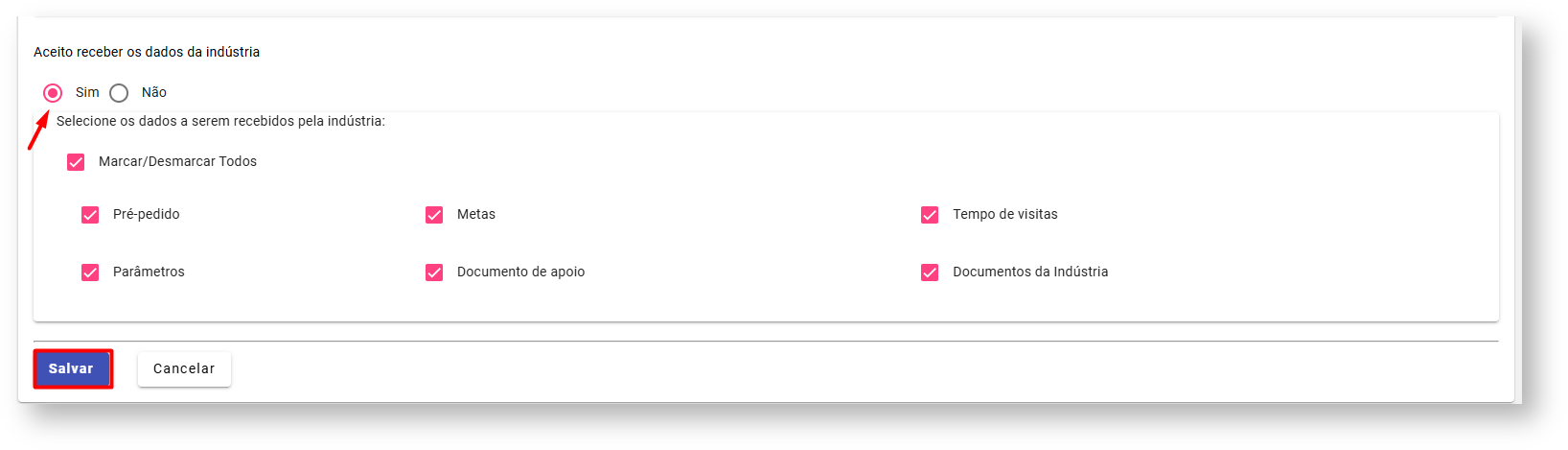 5- Verifique se a opção de Receber dados da Industria está marcado como Sim e se os dados desejados também estão devidamente marcados, clique em salvar.