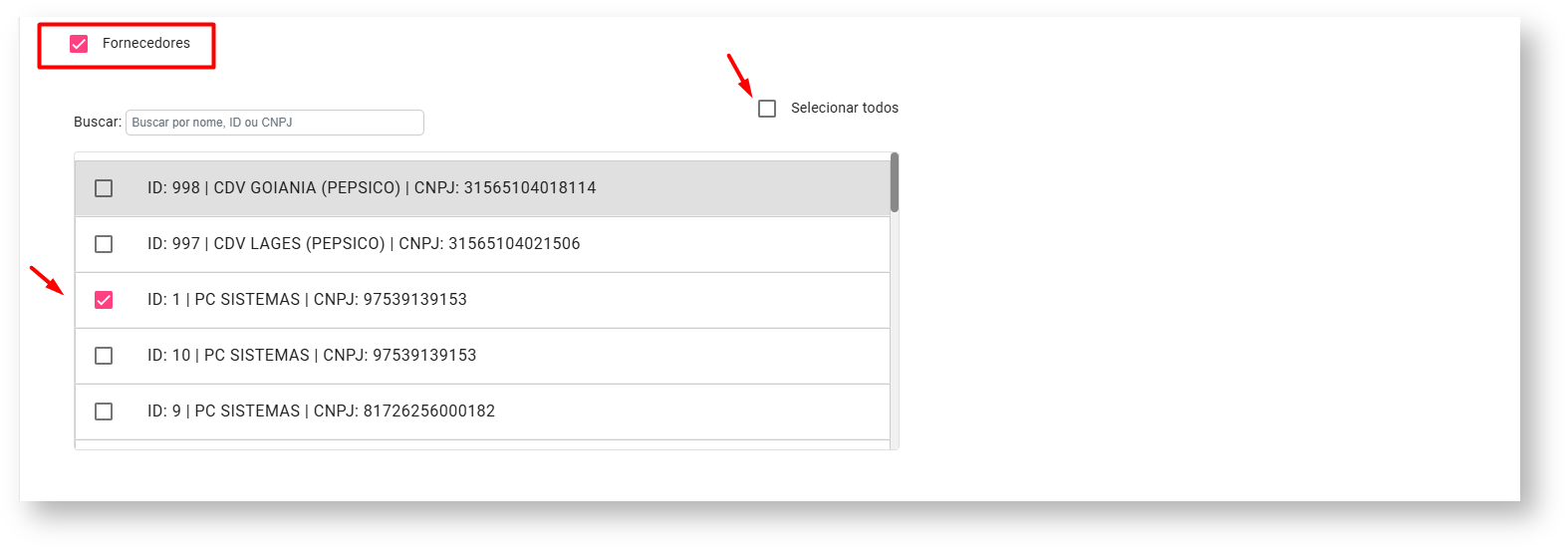 4- Caso esteja marcado Fornecedor é necessário selecionar os fornecedores marcando individualmente ou em selecionar todos