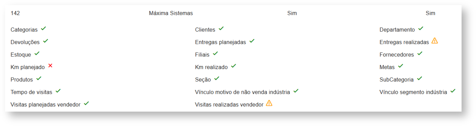 - Visitas planejadas vendedor: Verifica se tem rotas cadastradas pelo ERP ou Roteirizador de vendedor para vendedores que estão marcados como indústria igual a S (sim) conforme informado no item 7. Caso não haja nenhum vendedor marcado, mesmo que tenha rotas cadastradas irá apresentar como se não tivesse registro.