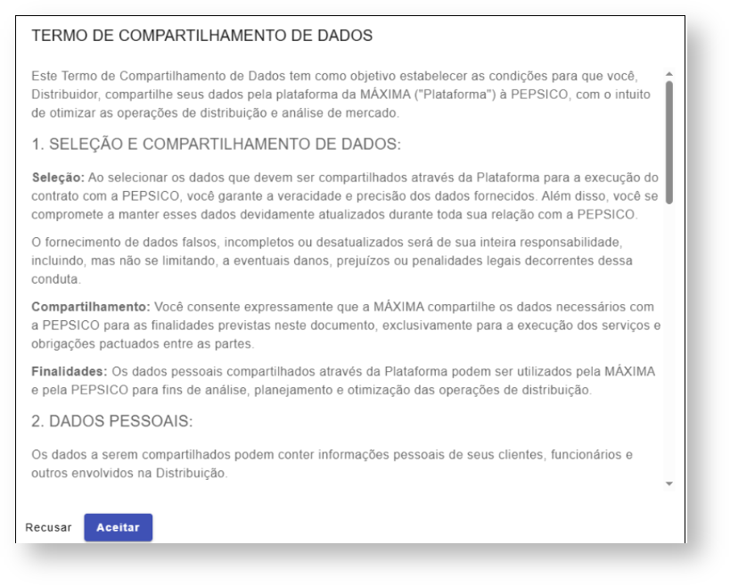 6- Ao clicar em Salvar será apresentado o termo de compartilhamento de dados, para que as alterações sejam salvas é necessário aceitar o termo.
