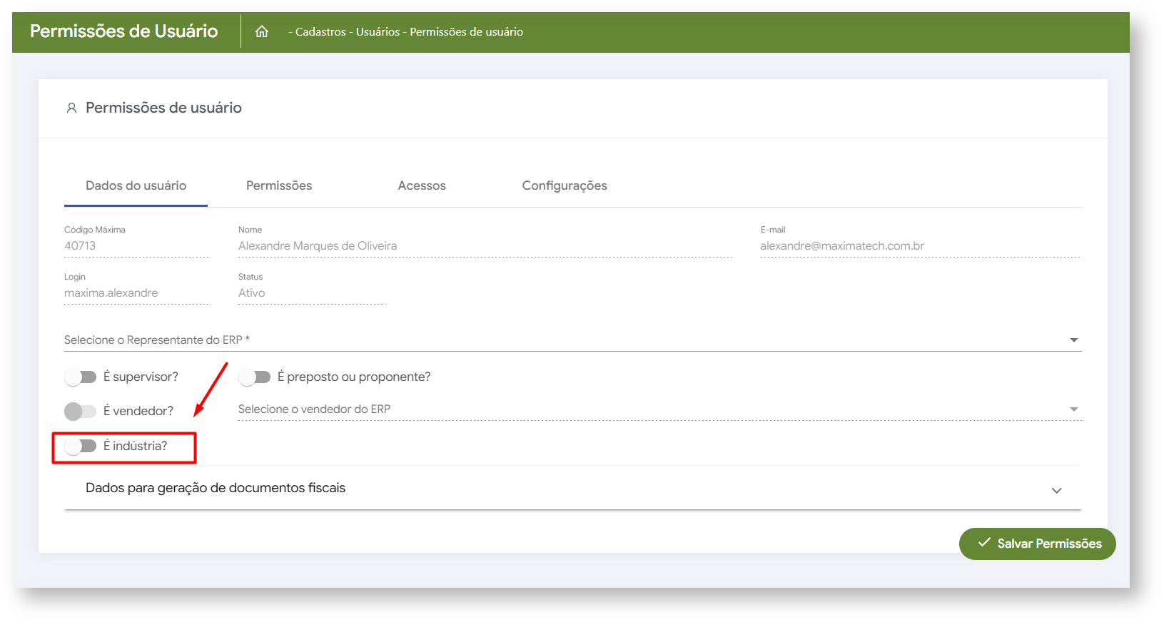 Obs. Quando mencionado abaixo sobre permissões, está se referindo as informações marcadas para compartilhar com a Industria, conforme mostrado no item 3 deste documento.