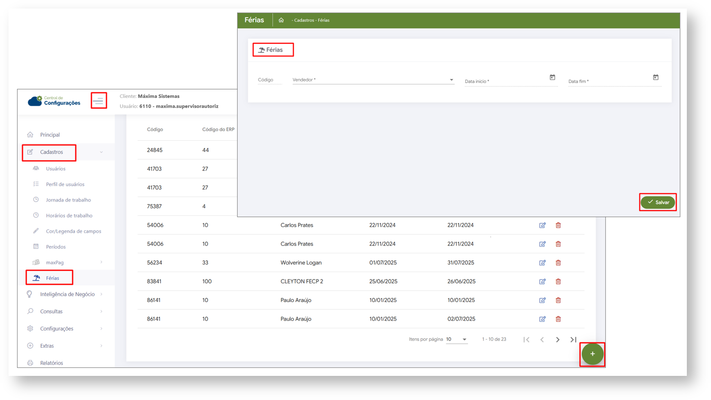 5- Nessa tela poderá criar novo cadastro de férias clicando no ícone de +, após criado é possível nessa tela editar ou excluir o mesmo caso necessário.