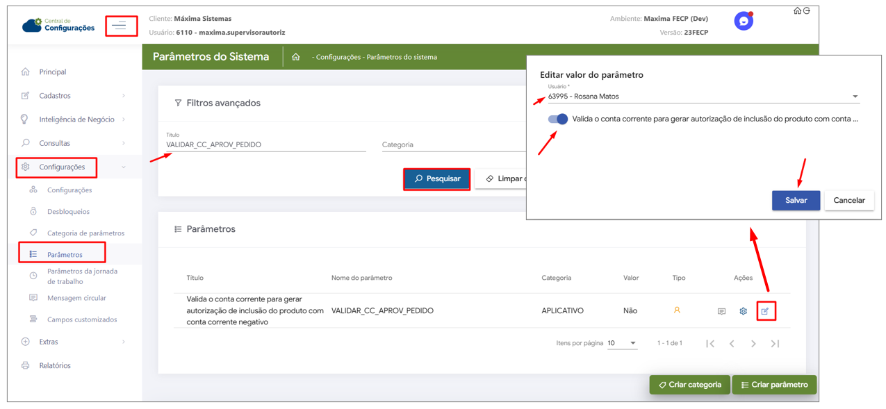 2- Busque pelo Parâmetro VALIDAR_CC_APROV_PEDIDO e clique em pesquisar