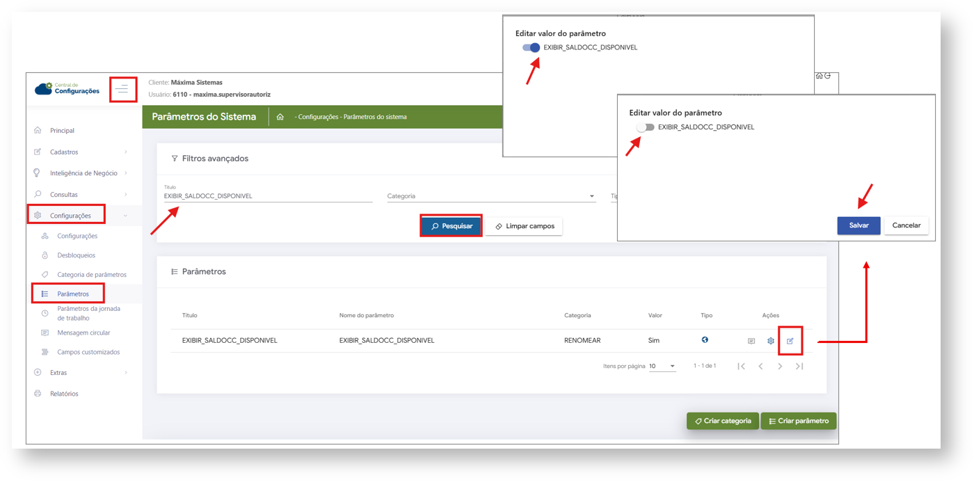 6- Busque pelo parâmetro EXIBIR_SALDOCC_DISPONIVEL filtro avançado e clique em pesquisar