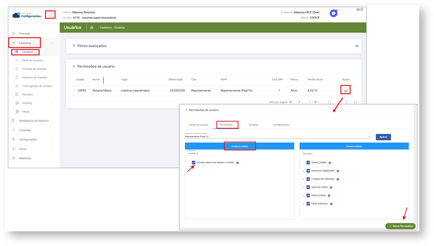 3- Acesse a Aba Permissões> Quadro Acesso à Rotinas