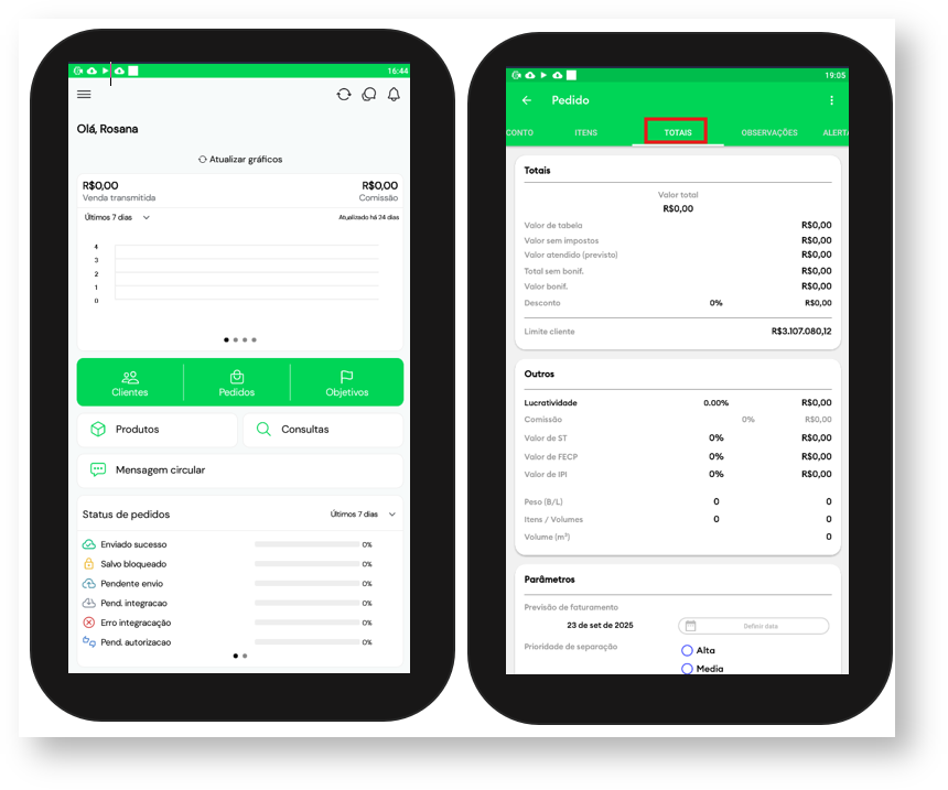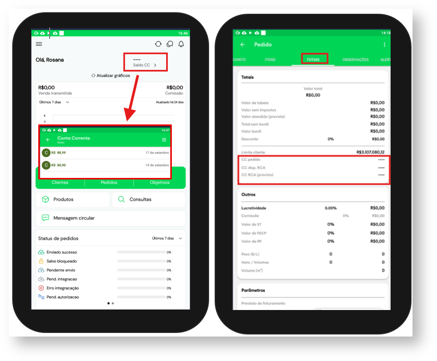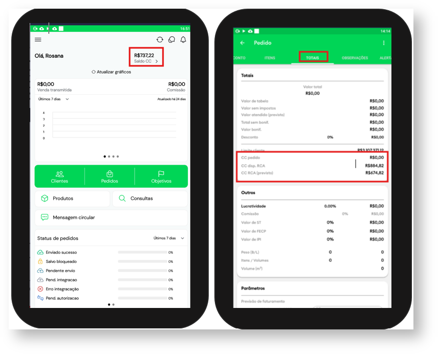 4- Quando o Parâmetro marcado (S) Exibir + Permissão Marcada (S) Ocultar - Todas as informações de Saldo serão completamente ocultas, tanto na tela inicial quanto na aba totais do Pedido.