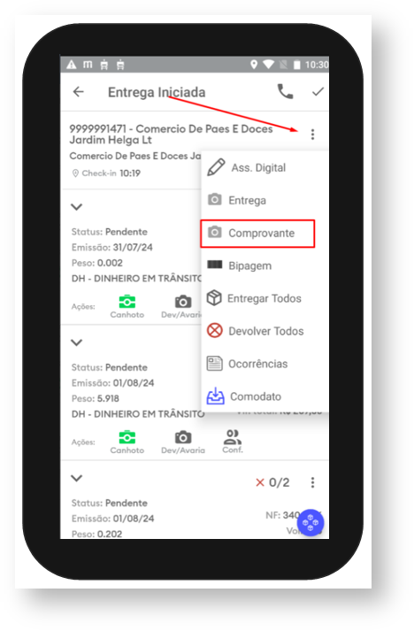 5- Na tela de entrega iniciada clique no ícone de três pontos e selecione a opção comprovante e tire a foto do canhoto