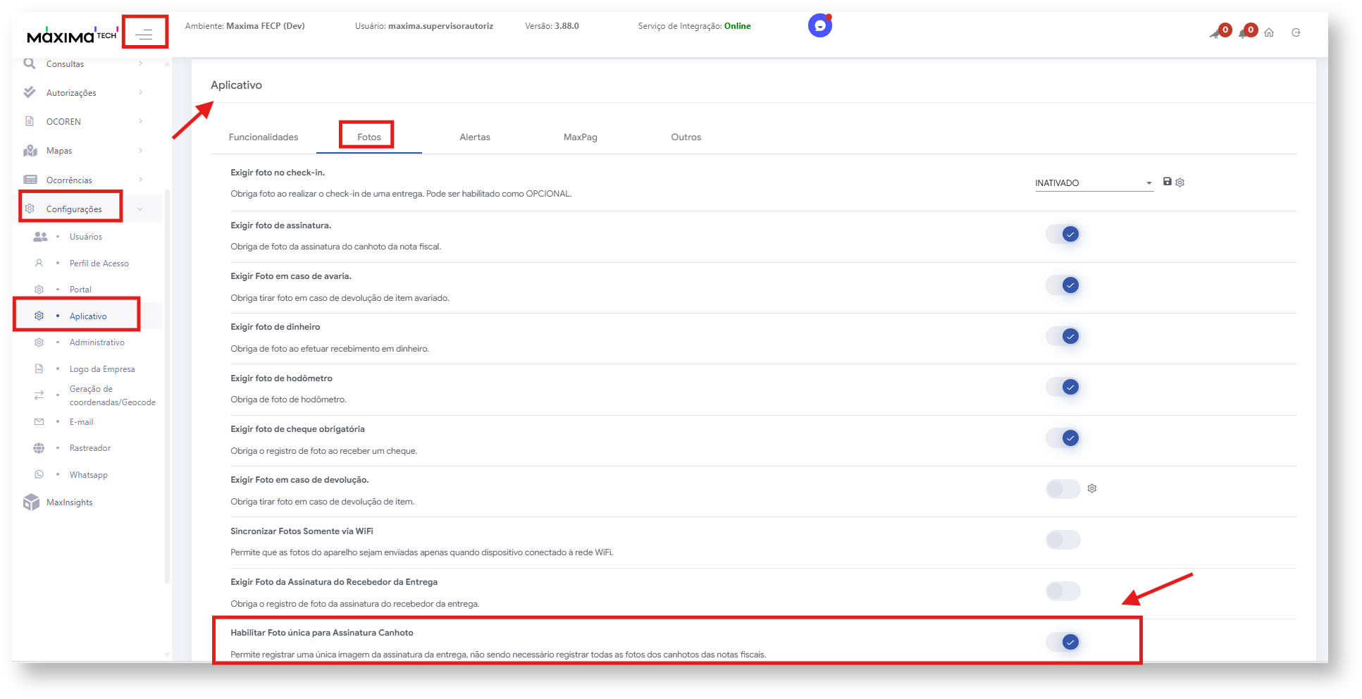 3- Acesse a aba Fotos e habilite marcando o Parâmetro Habilitar foto única para Assinatura canhoto.