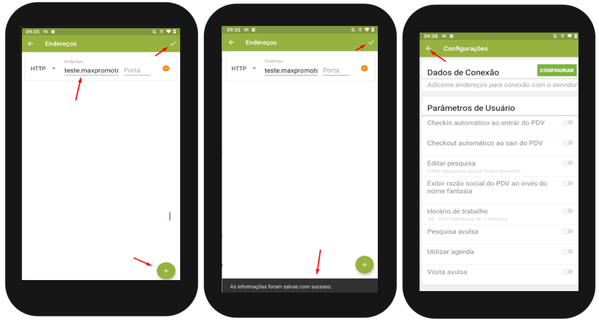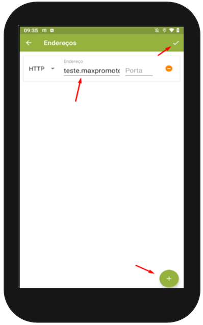 1-Na tela de configuração do aplicativo, acesse a aba ENDEREÇOS e toque em + (mais) para adicionar um novo endereço.